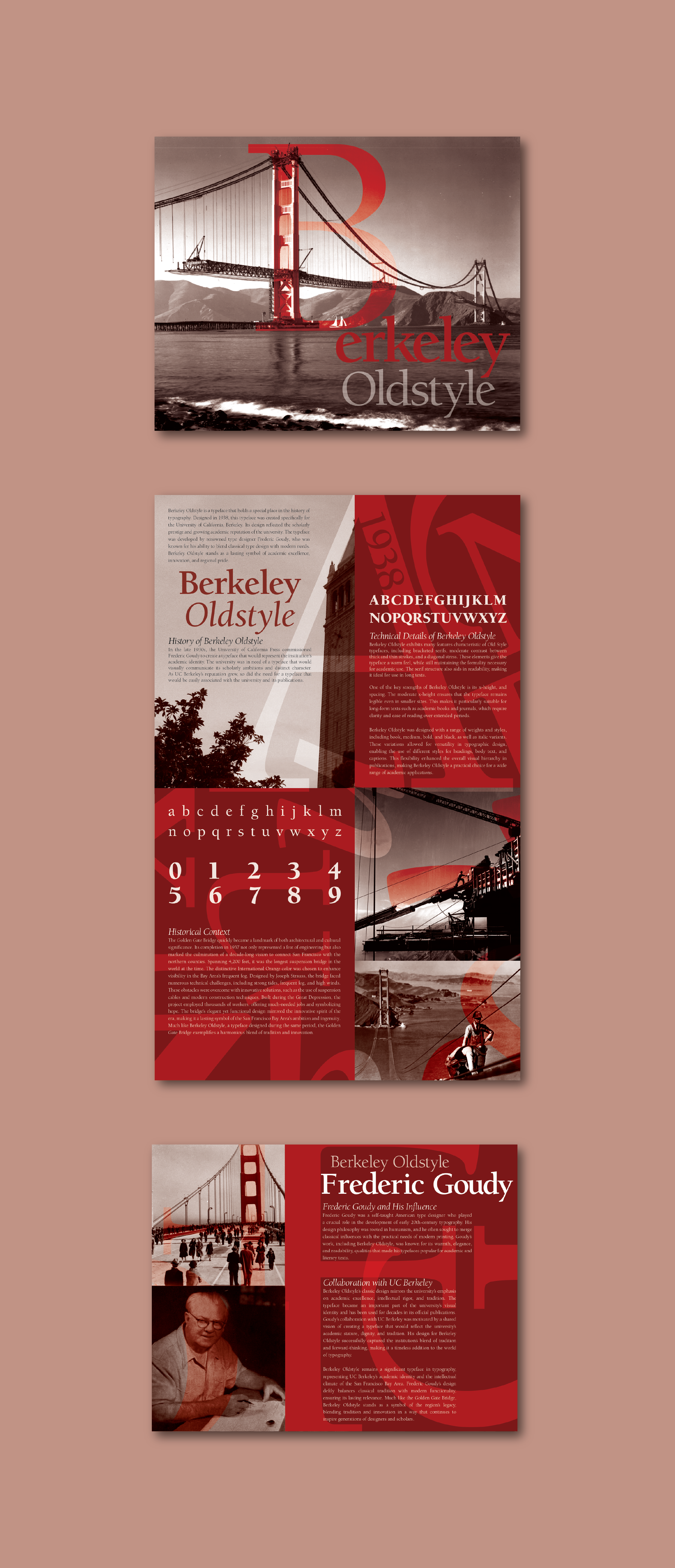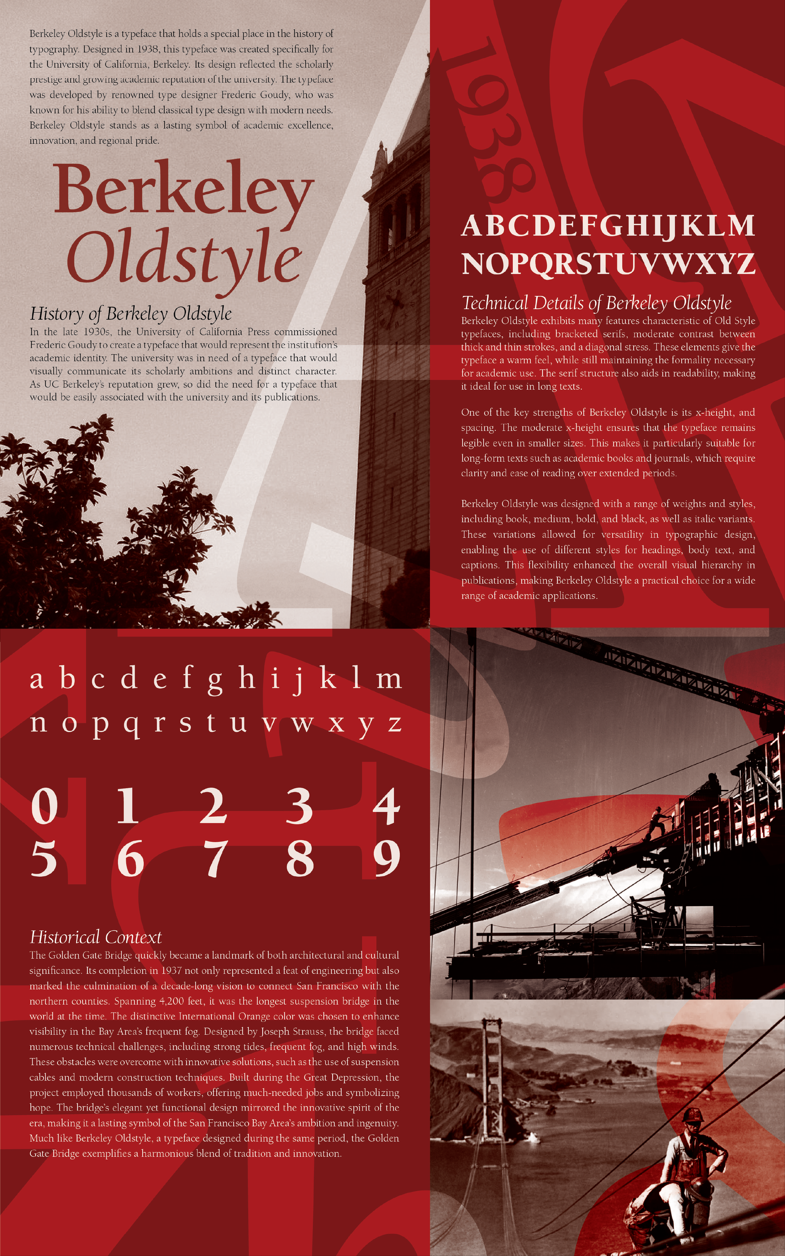 Color Theory & Historical Context: The red color scheme was chosen as a direct reference to the Golden Gate Bridge, reinforcing the connection between the typeface and its historical context. This use of color evokes strength, innovation, and legacy—key themes associated with both the bridge and Berkeley Oldstyle.